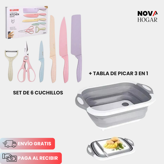 Set de Utensilios + Tabla 3 en 1: Mejora la Eficiencia y Belleza de tu Cocina