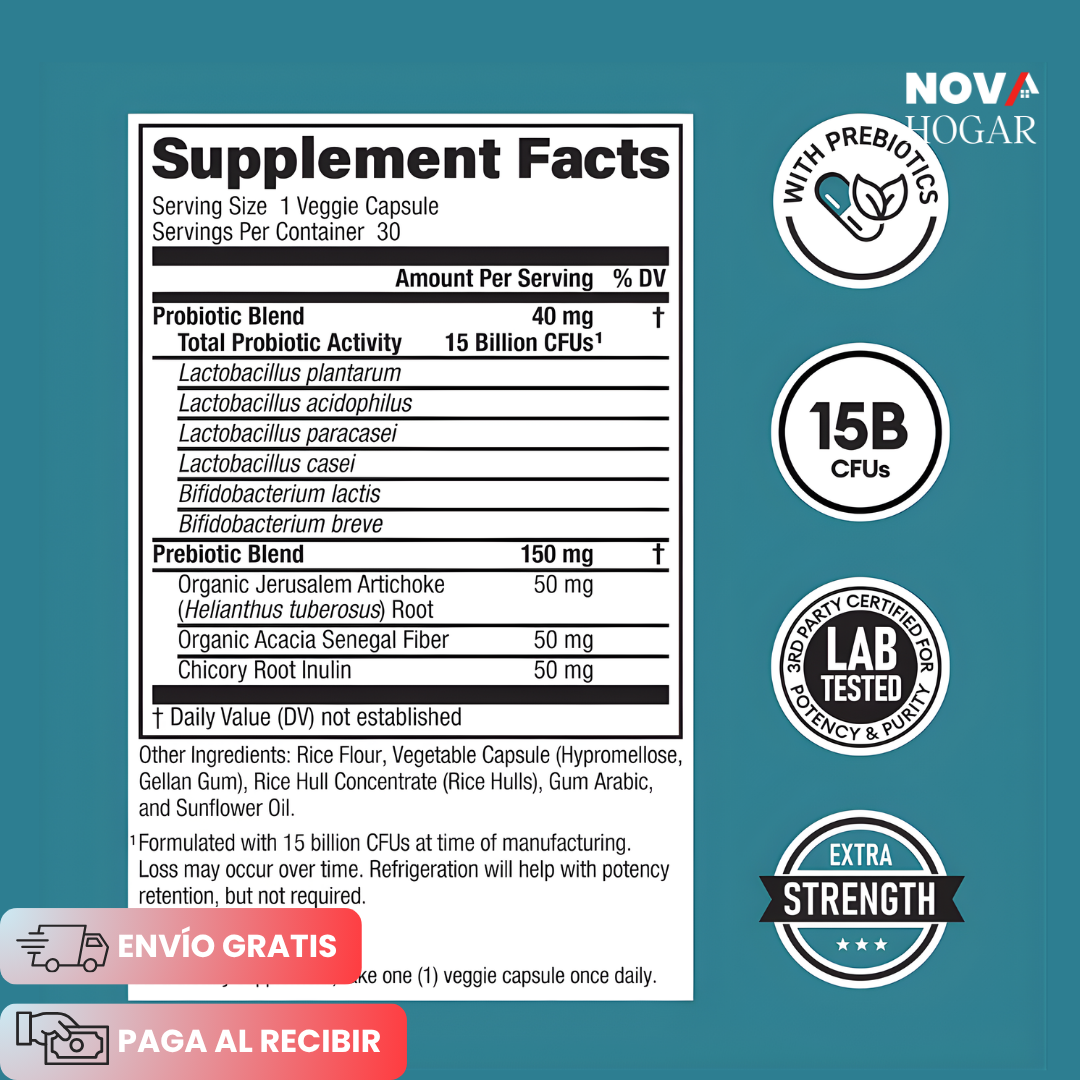 Con 60 mil millones de cultivos vivos de 10 cepas bacterianas, ofrece un enfoque integral para mejorar tu salud digestiva.