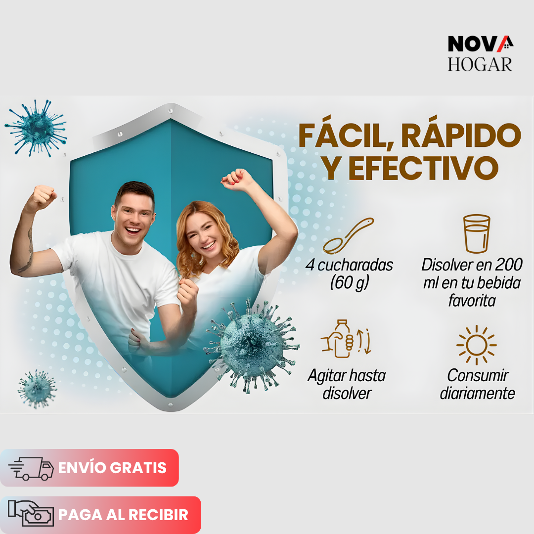 Mezcla una porción diaria en agua o tu bebida favorita para disfrutar sus beneficios nutricionales y fortalecer tus defensas naturalmente.