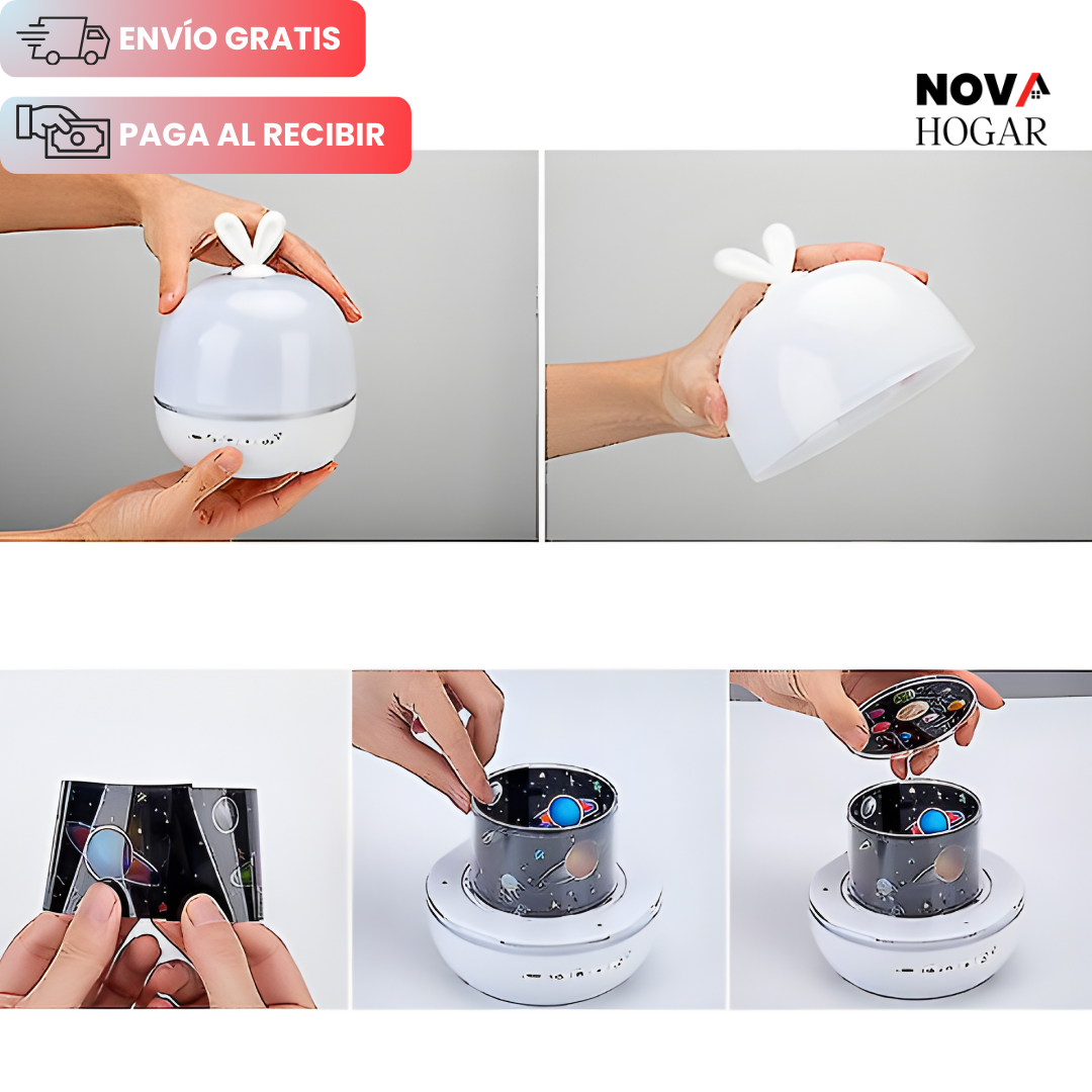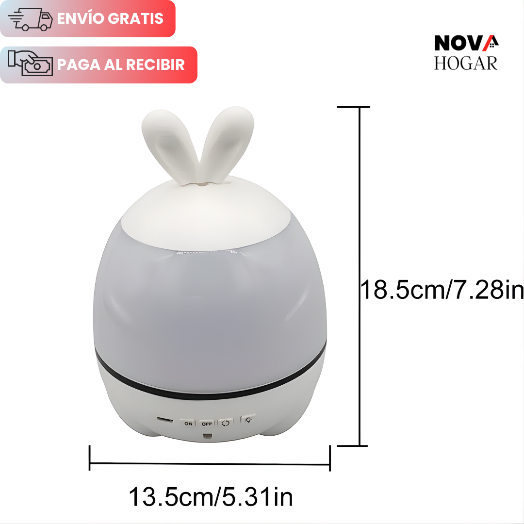 Esta lámpara proyecta 15 diseños mágicos diferentes, desde unicornios hasta galaxias, creando una nueva aventura cada noche para que duerma feliz, tranquila y segura.